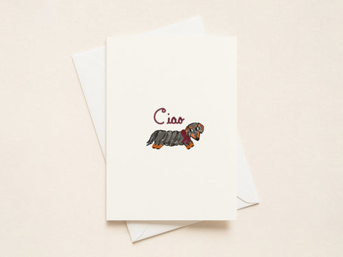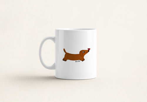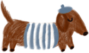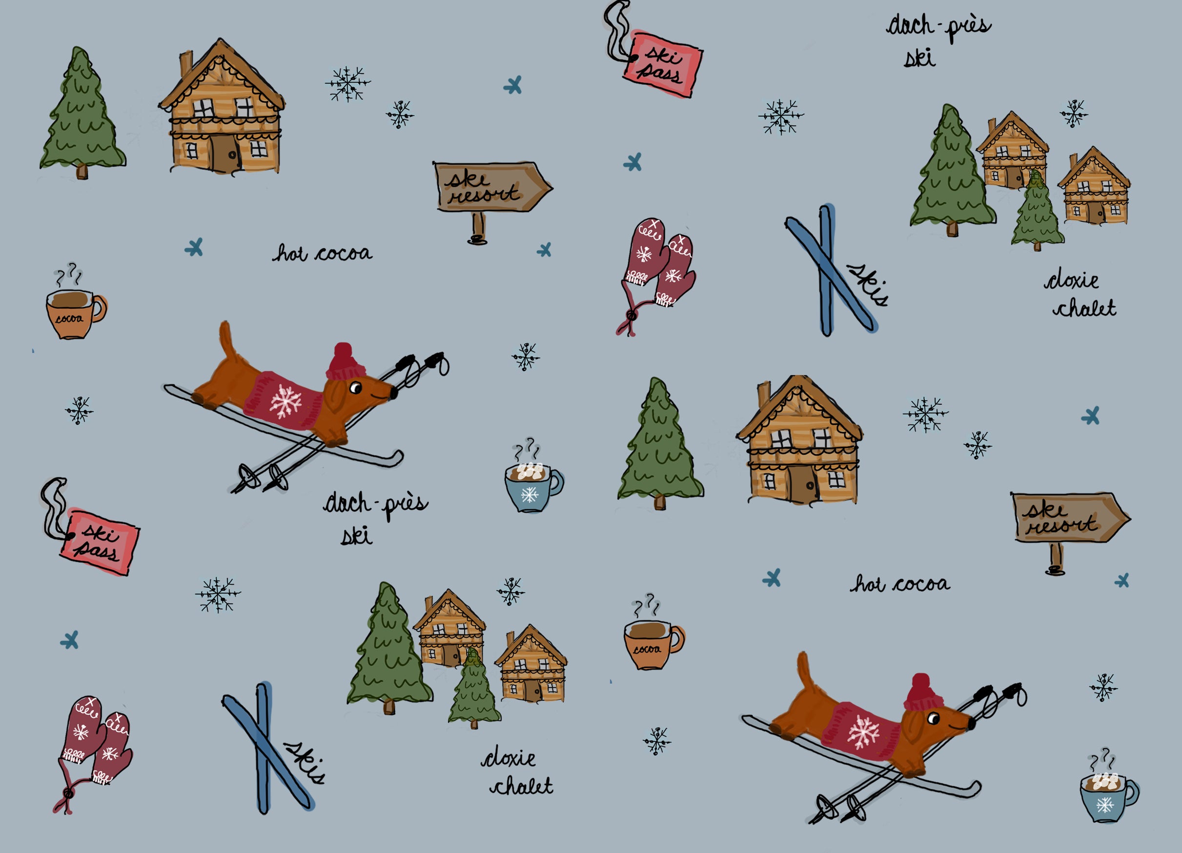 Our little brown dachshund hits the slopes in a cozy red sweater before indulging in some hot cocoa in the Doxie Chalet.